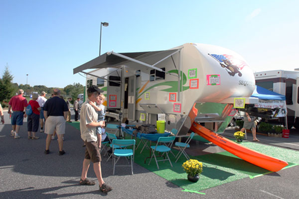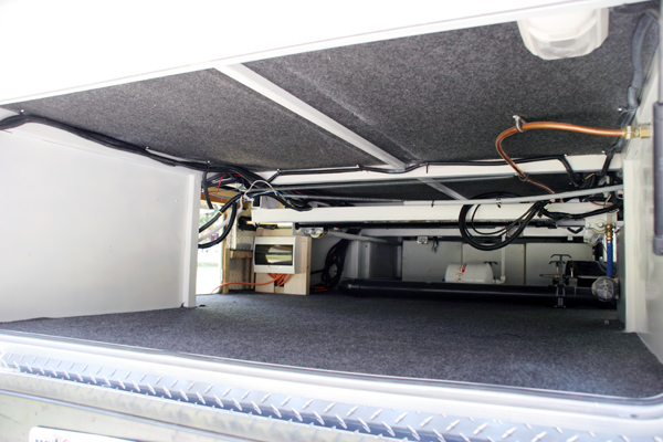 The roadside of the Sequoyah with the basement doors open. Note that there are no pipes, boxes, or anything else hanging down beneath the fifth wheel. Nothing to get damaged from rocks, curbs, and other hazards, and a clean, smooth under carriage leads to better towing efficiency and better mileage. Why aren't all fifth wheels like this? Because they don't use the Sequoyah's patented box construction which allows us to carefully place those components in a safe environment, away from the hazards of the road.